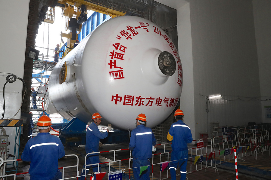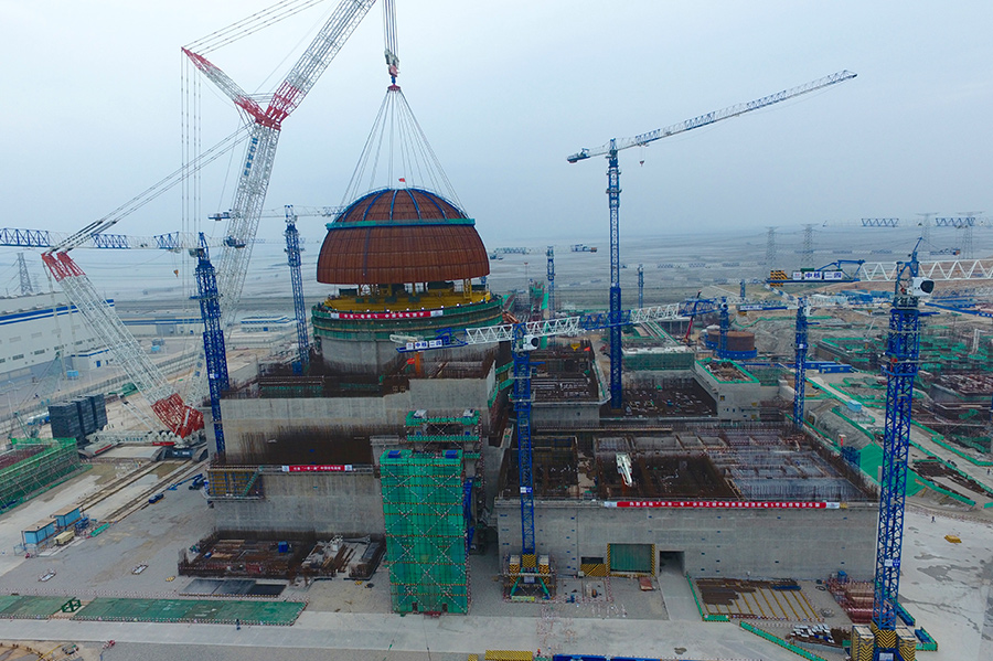 5月25日,“华龙一号”全球首堆示范工程福建福清核电5号机组完成穹顶吊装。新华社记者姜克红 摄